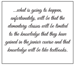WIKRAMARATNE: This is unfortunate. The orientation of the world must come first before you begin to classify. So what is going to happen, unfortunately, will be that the elementary classes will be limited to the knowledge that they have gained in the junior course and that knowledge will be like textbooks.